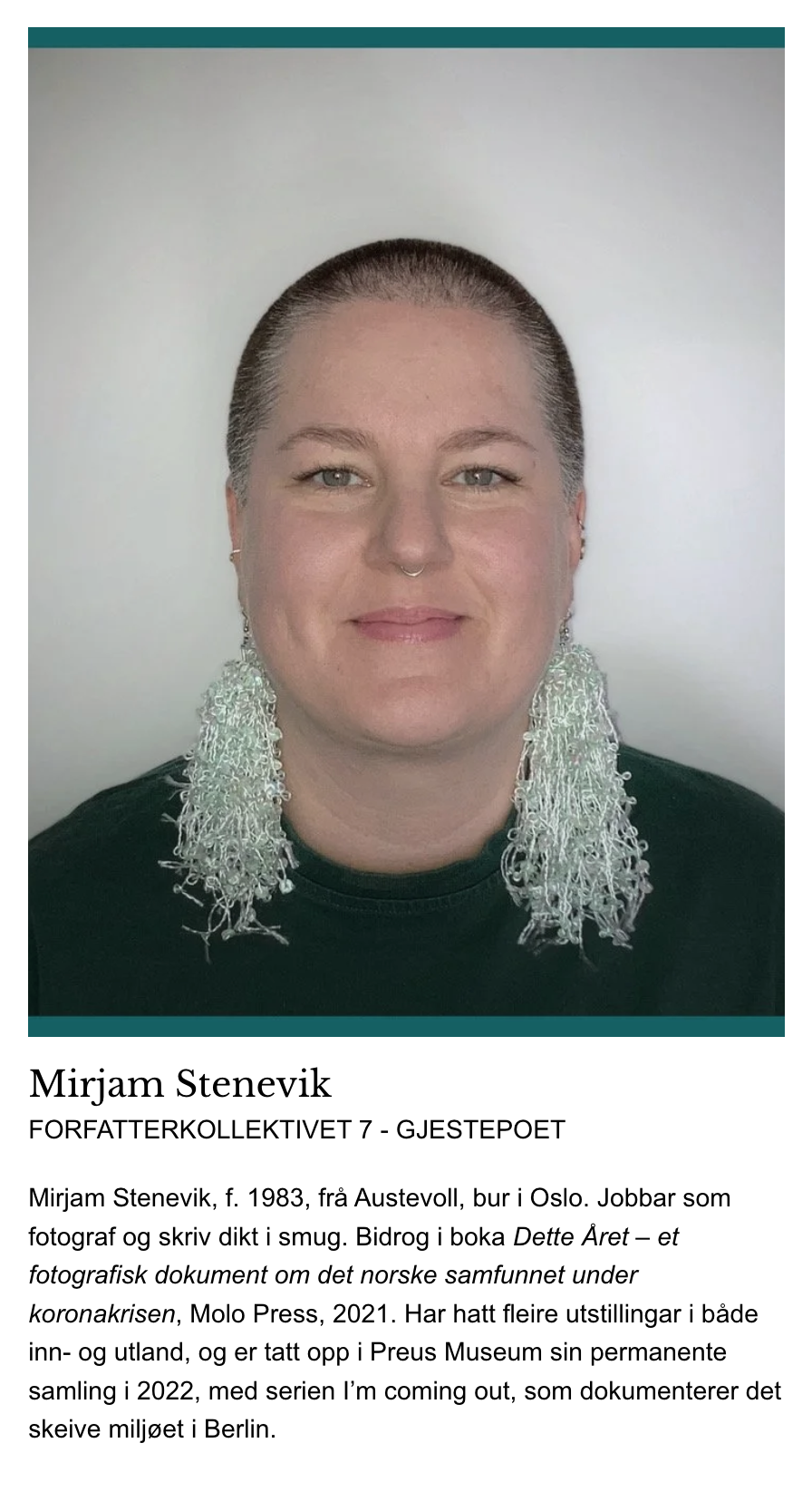 Mirjam Stenevik (b.1983) is a documentary photographer, educator and poet based in Oslo, Norway. She has a BA (hons) in Illustration from Falmouth University, in addition to three years at Bilder Nordic School of Photography, where she was mentored by Marcus Bleasdale, Linda Bournane Engelberth, Chris Harrison, Cheryl Newman and Damian Heinisch, among others. Since graduating in 2016, she has participated in numerous exhibitions and won several awards, both in Norway and abroad. Her project “I’m coming out” is part of the permanent collection at Preus Museum. She has also been an assistant for VII photo agency photographer Linda Bournane Engelberth, as well as assisting at an unknown number of photography workshops. Spending time in the forest with her dog currently has the highest priority, but the rest of the time is divided between teaching, assignments and personal projects - the latter mainly focusing on contemporary social issues, nature and daily life. Member of Forbundet Frie Fotografer (FFF), Women Photograph, VISP, Creatives for Climate, we[dot]art and Foreningen Startblokka. Board member of Queerness. Artwork can be purchased via Atelie Art.